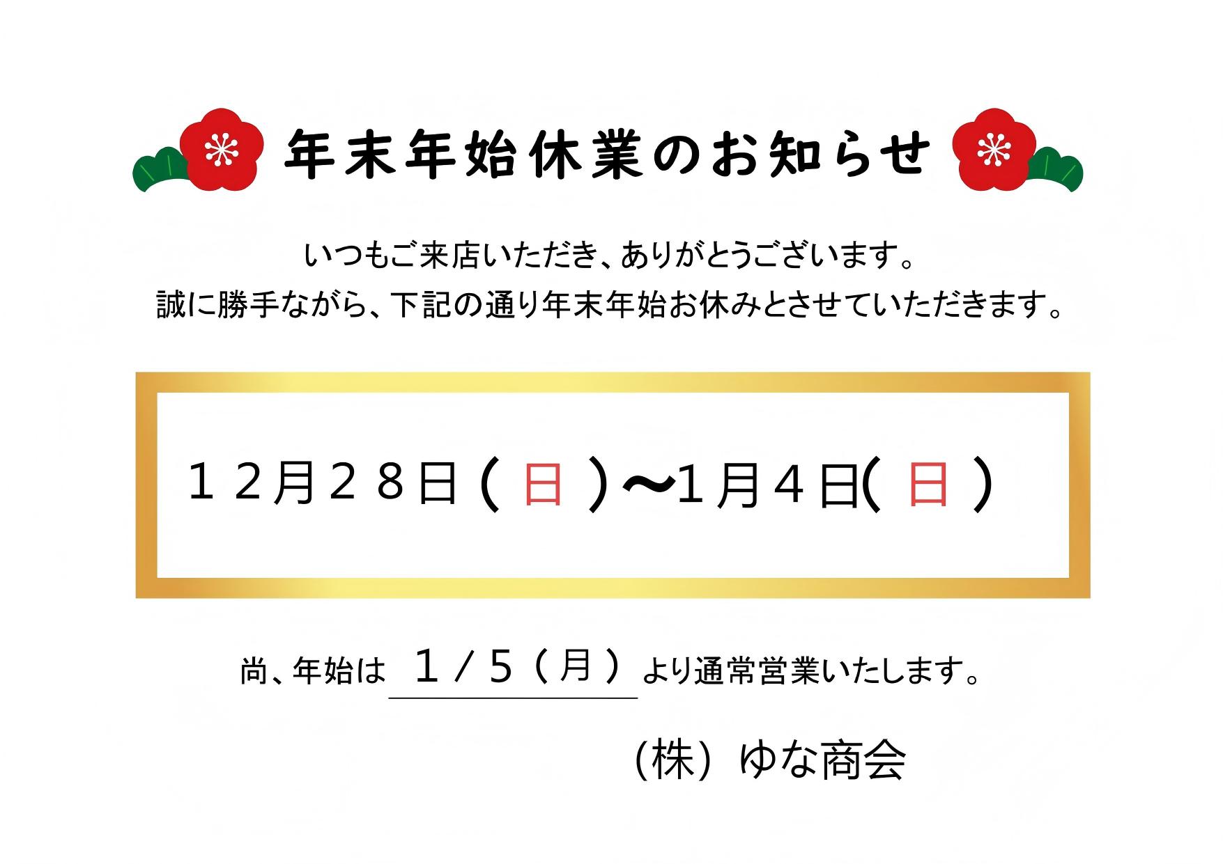 ㈱ゆな商会では誠に勝手ながら、年末年始休業日を下記のとおりとさせていただきます。